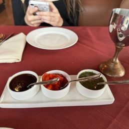 Absolutely delicious. The chicken tikka masala was thicker than what we usually have, but it made for a hardier dish. The lamb saag was moist and tender with a slight hint of mint. The naan was perfectly crispy and chewy at the same time. Lots of garlic sprinkled on top. So fragrant. And our apps were super flavorful. Everything was served in quaint copper ware. Even the glasses for water were copper. Add superb service and distinct decor and it made for a wonderful dining experience.